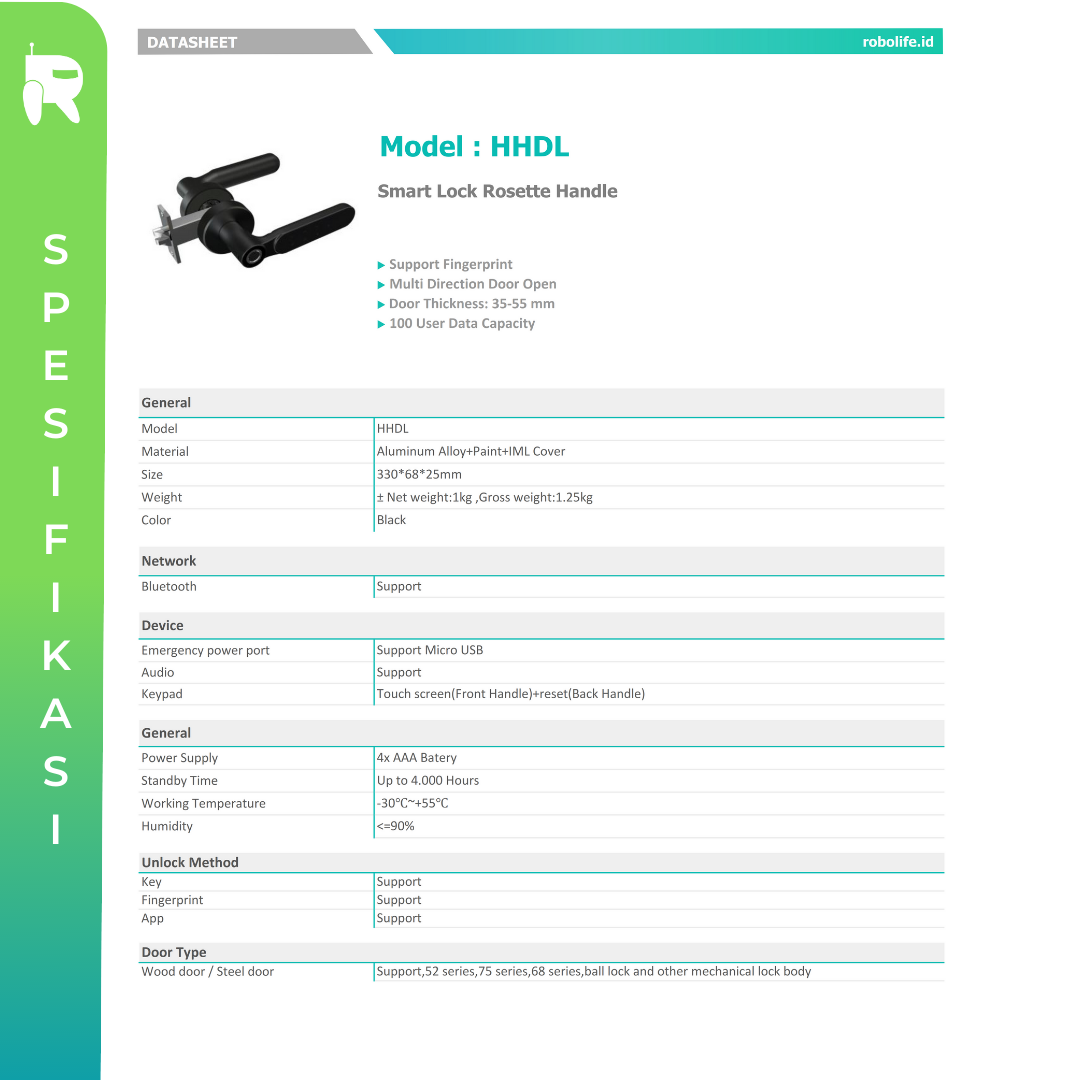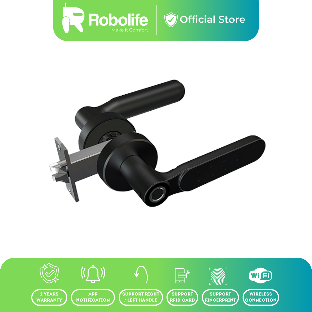 Robolife Smart Door Lock merupakan ganggang pintu pintar yang dapat memberikan keamanan serta kenyamanan bagi para penggunanya. Perangkat Robolife smart door lock dibekali dengan beberapa fitur kunci keamanan seperti Fingerprint, Pin, Mechanical Key atau Kunci Fisik. Dapat dikontrol melalui handphone dengan menggunakan koneksi Bluetooth tidak bisa wifi.